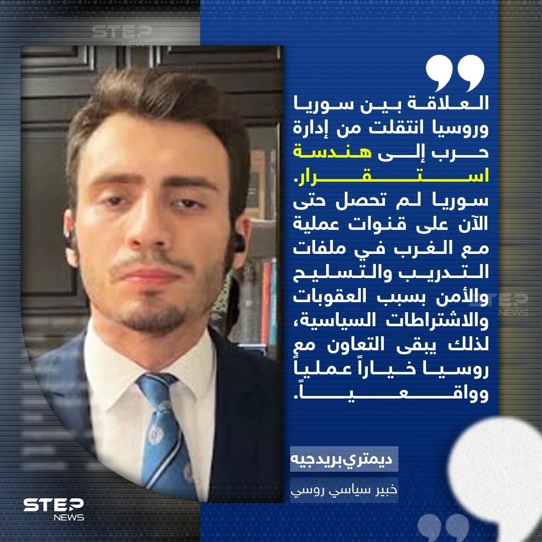 هذا ما يوضحه الباحث الروسي ديمتري بريدجيه، خلال حديث مع وكال ستيب نيوز قائلاً: "العلاقة انتقلت من إدارة حرب إلى هندسة استقرار. سوريا لم تحصل حتى الآن على قنوات عملية مع الغرب في ملفات التدريب والتسليح والأمن بسبب العقوبات والاشتراطات السياسية، لذلك يبقى التعاون مع روسيا خياراً عملياً وواقعياً".