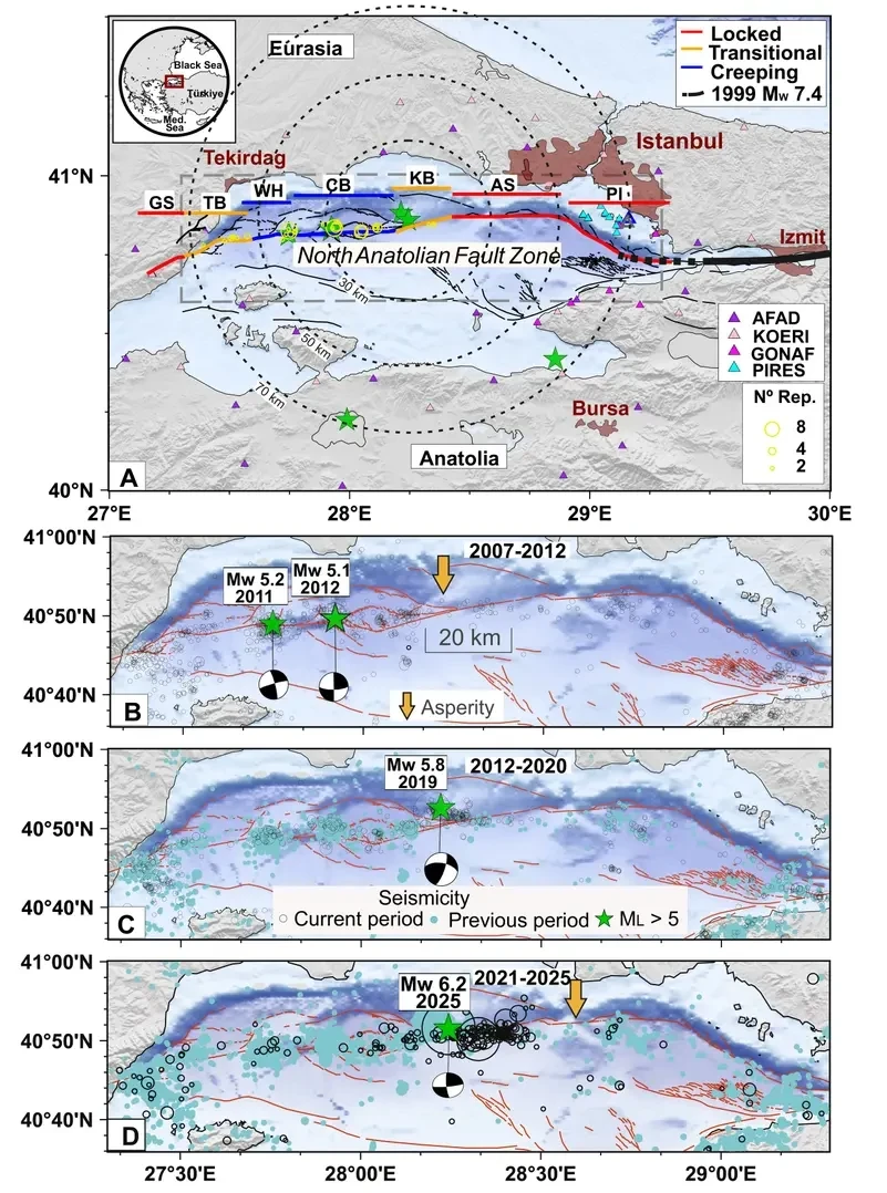 وقد أظهر هذا الصدع تسلسلاً من الزلازل التي تهاجر غربًا بقوة تزيد عن 7 درجات في دوراته الزلزالية الثلاث الأخيرة. تُشكل منطقة صدع مرمرة الرئيسي، وهي جزء من صدع الأناضول الشمالي، فجوة زلزالية كبيرة تبلغ حوالي 120 كيلومترًا، مما يزيد من خطر وقوع زلزال كبير.