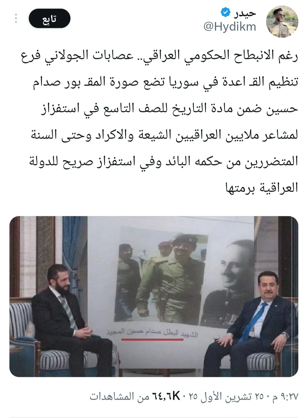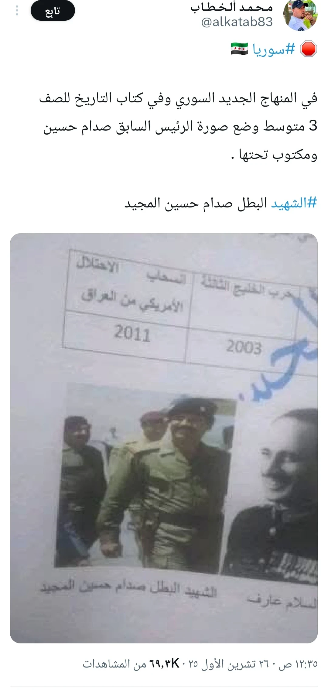 تداول نشطاء وصفحات عبر مواقع التواصل الاجتماعي خبرا بعنوان "صدام الشهيد في مناهج سورية.. قرار من الجولاني بتغيير تسمية بعض الشخصيات داخل المدارس".