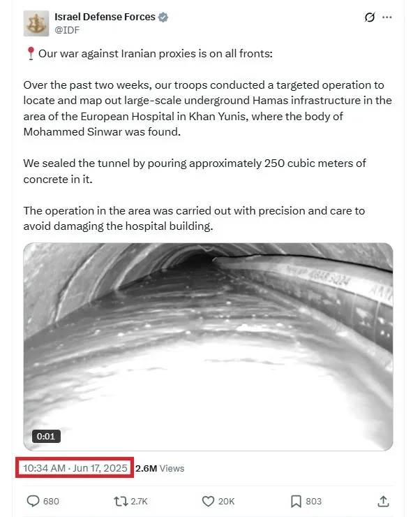 حظي الفيديو بما يزيد عن مليوني مشاهدة في منصة إكس وحدها، مصحوبًا بوصف مُضلل يقول: "الجيش الاسرائيلي المجرم ينشر اللحظات الأولى لإغراق نفق بمدينة رفح بالأسمنت وبه أكثر من 150 مقاومًا".