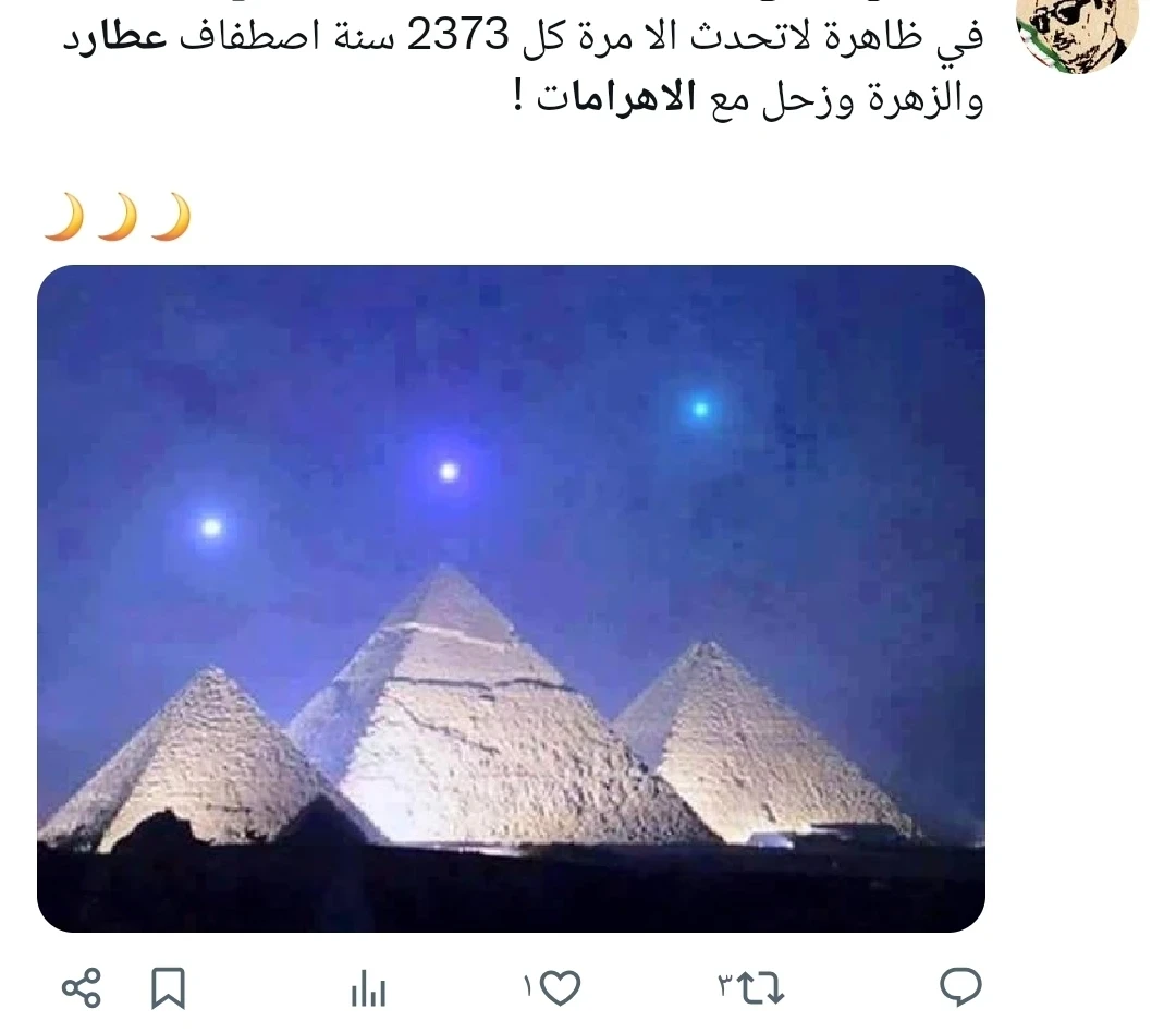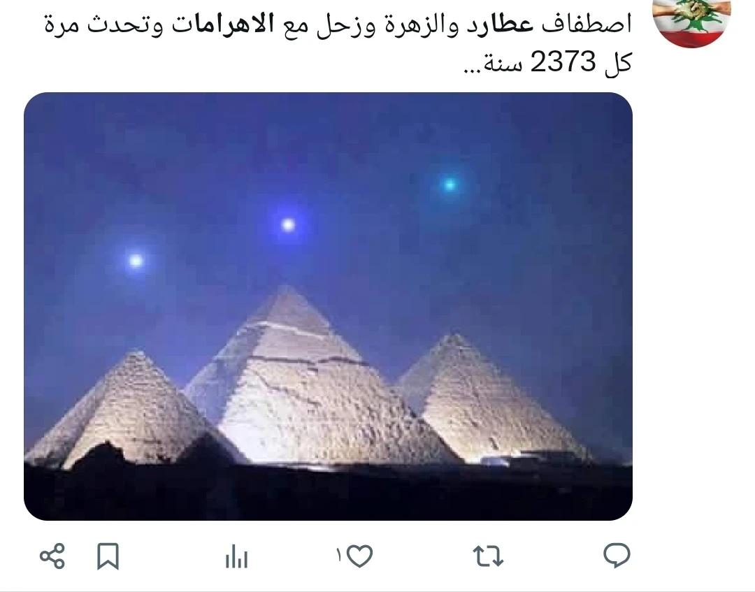 بالبحث والتحري، حول صورة عطارد والزهرة وزحل فوق أهرامات الجيزة يحدث هذا مرة كل 2373 سنة، فإن الصورة معدلة رقميًا تُدّعي تواجد كواكب عطارد والزهرة وزحل فوق أهرامات الجيزة، لكنها خدعة معروفة تتكرر منذ عام 2012 دون أساس فلكي حقيقي.