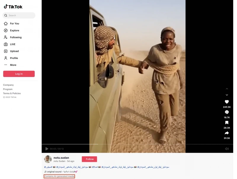 وبحسب مراجعة منشورات، يتخصص الحساب في نشر مقاطع فيديو مولدة بالذكاء الاصطناعي تعبر عن معاناة السودانيين، في ظل الحرب المستمرة في السودان منذ منتصف أبريل/ نيسان 2023.