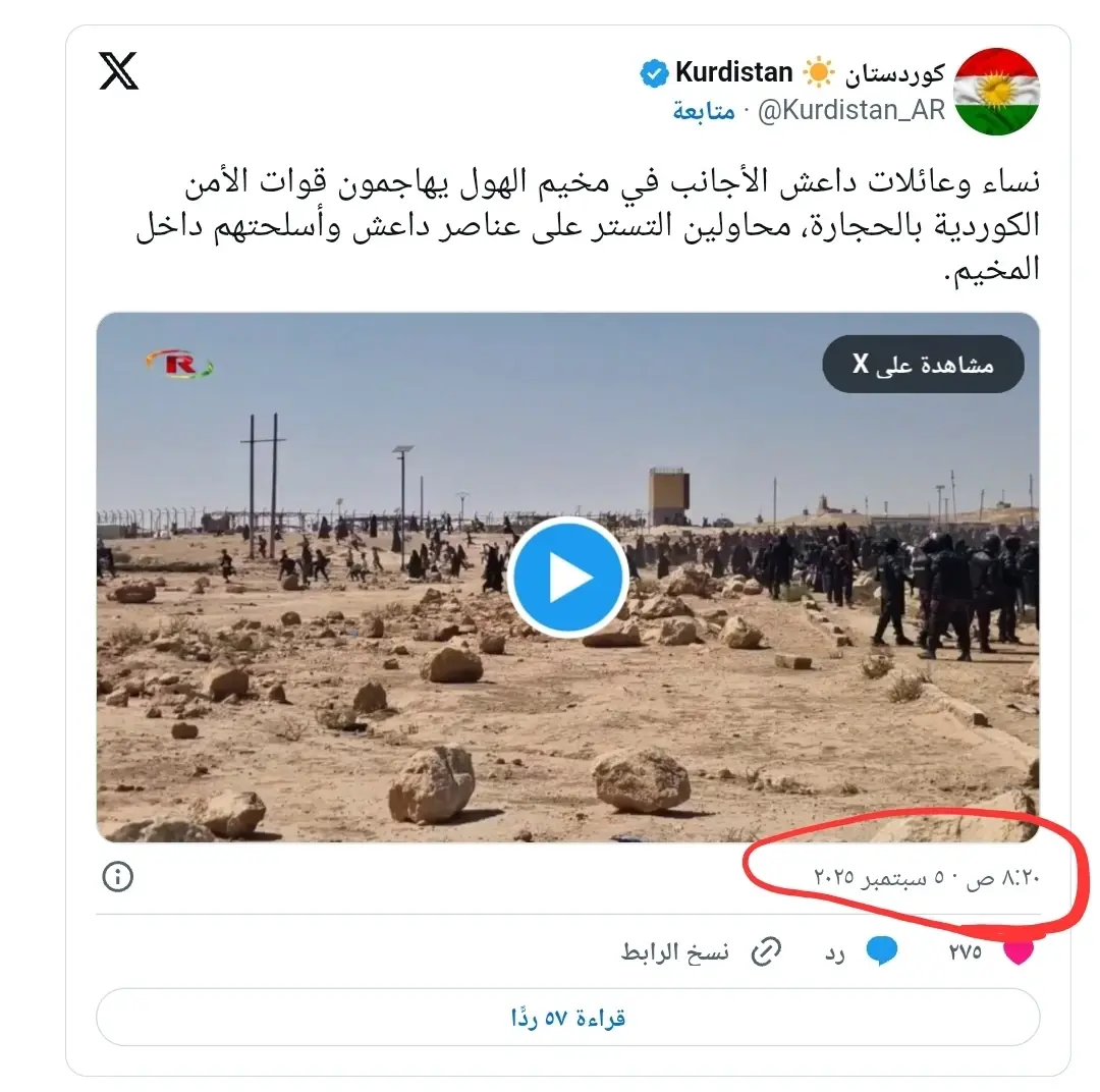 ويُظهر الفيديو، الذي نُشر بجودة منخفضة ومرفق بتعليق صوتي باللغة الكردية، مشاهد لرجال ونساء وأطفال يركضون في منطقة صحراوية، وقد أُرفق بتعليق يقول: "الآن، هروب آلاف الدواعش من مخيم الهول السوري المحاذي للحدود العراقية".